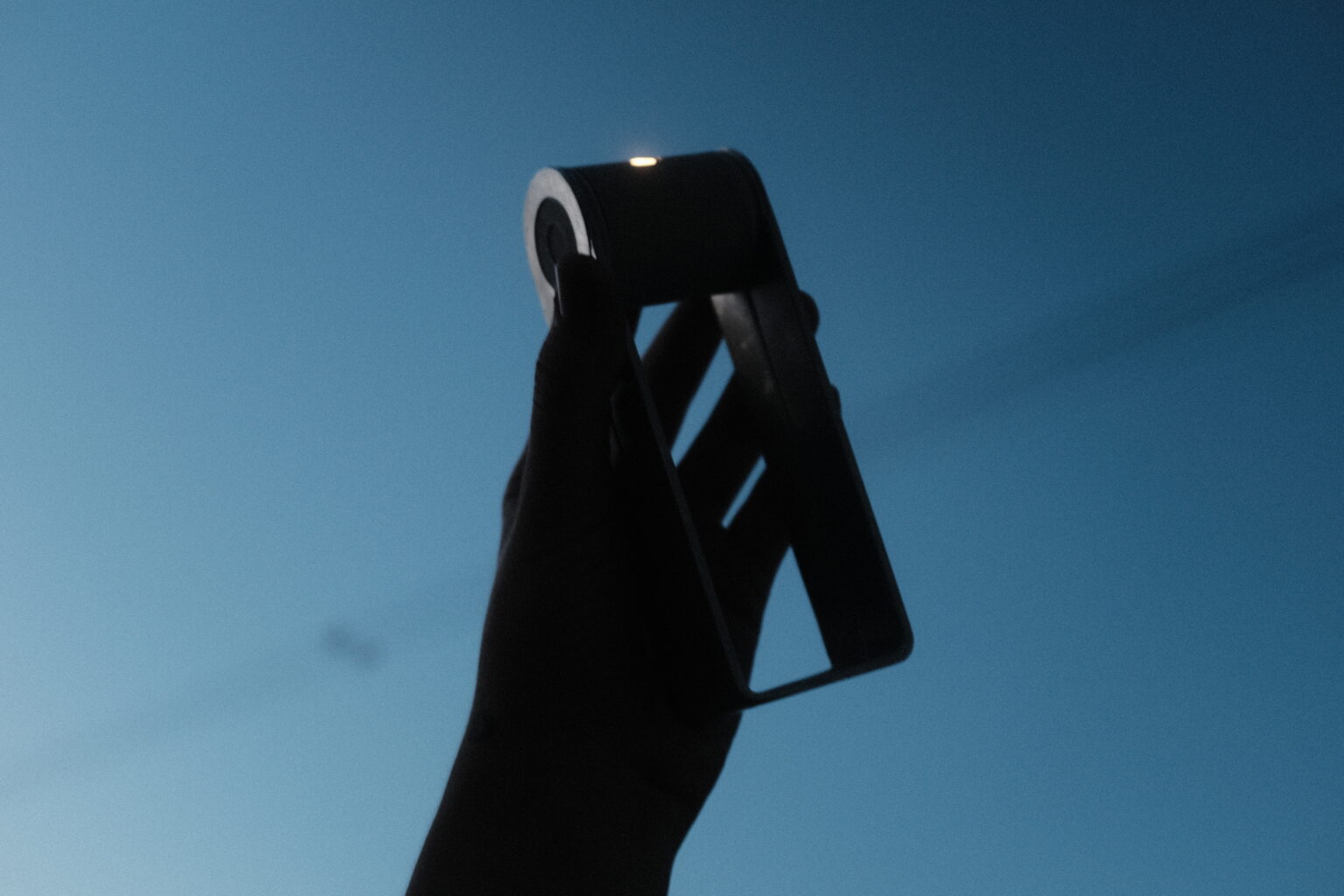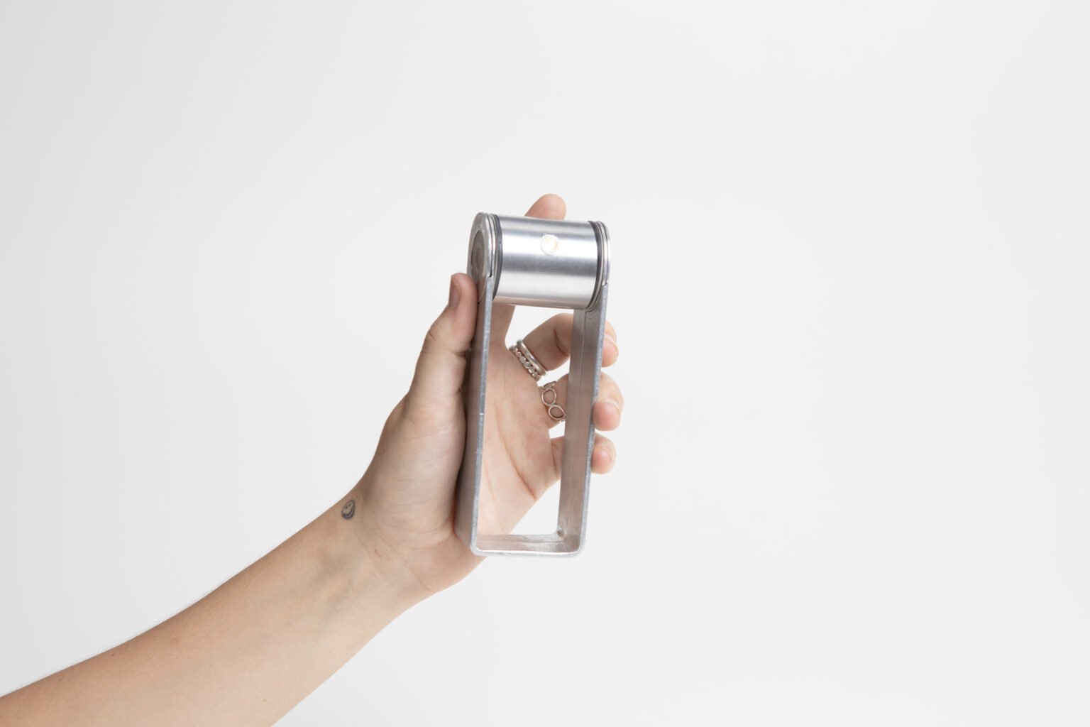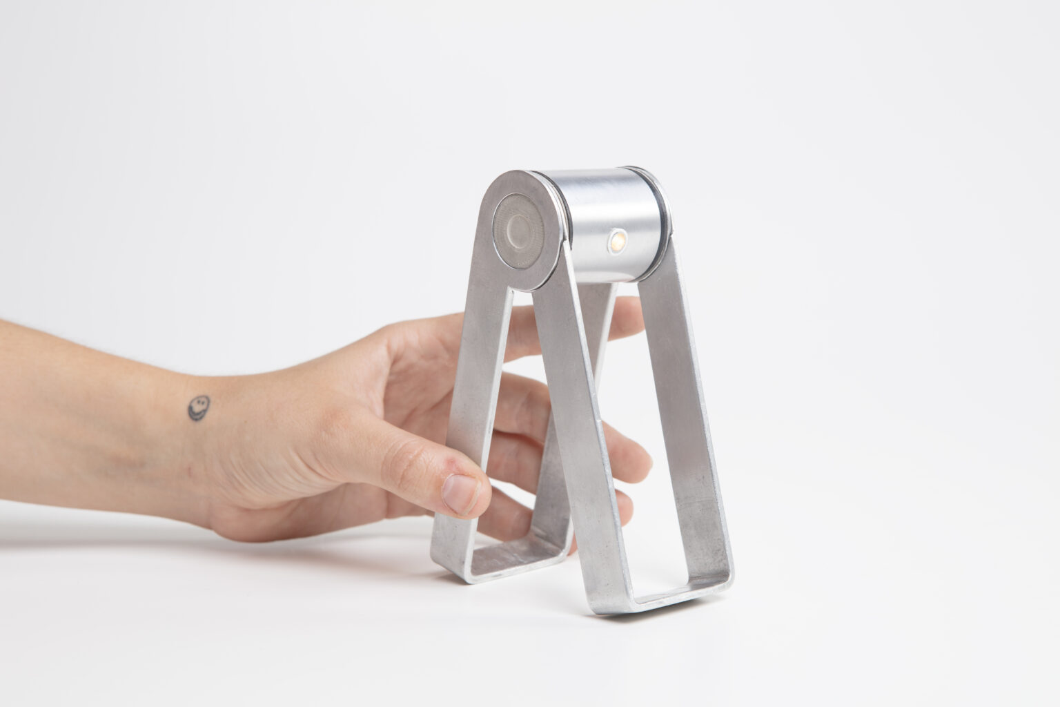 The design follows a radically minimal, tool-like aesthetic, reduced to only the most essential components. A rotating cylindrical head allows the beam to be precisely directed, held between two bent aluminum handles that enable multiple modes of use – serving as a stand, spacer, grip, or mounting loop for hanging.