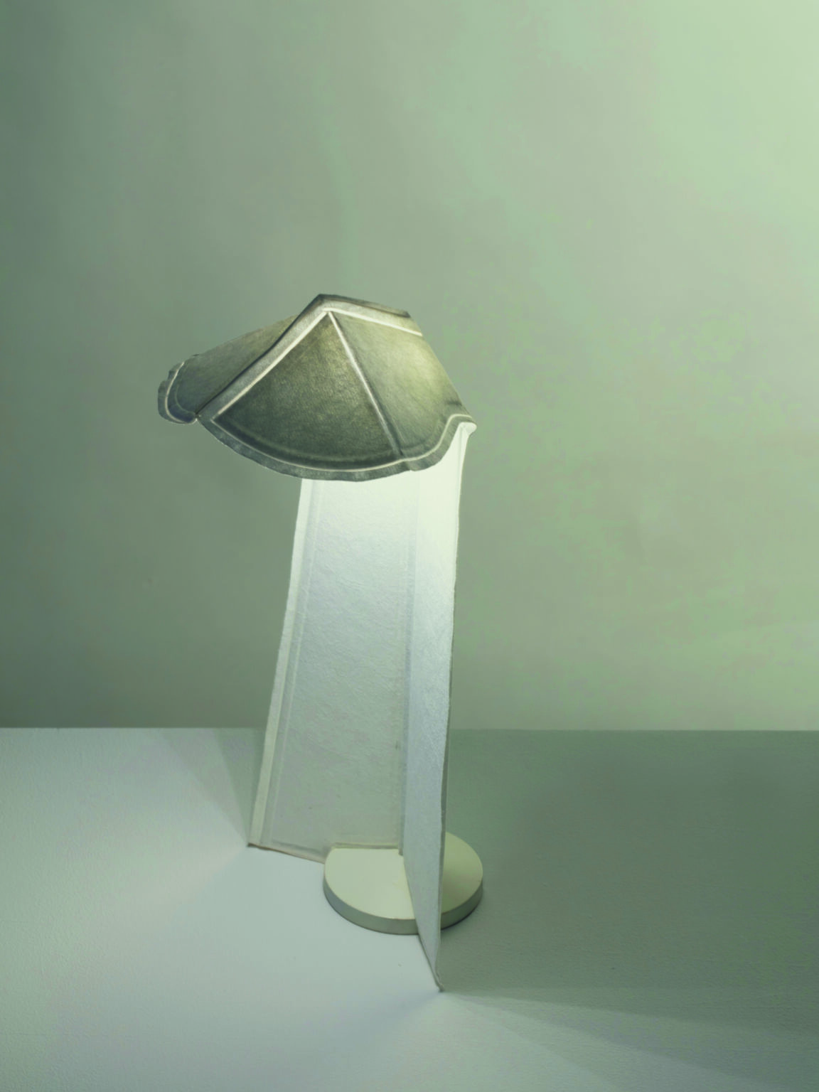 The direction of the light cone changes depending on how far the textile shade is unfolded. The lamp mimics the motion of a living being, responding to the user through gentle tilting and stretching. This is made possible by the textile’s engineered material properties, which define a built-in folding pattern that guides its transformation.